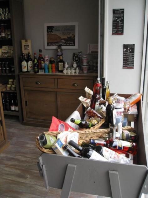Huiles, vinaigres, sauces tomates, thés, café, conserves artisanales Oteiza, foie gras de canard entier mi-cuit, magret de canard fumé ou séché), épices, madeleines Lamothe. Pain artisanal (céréales et levain)