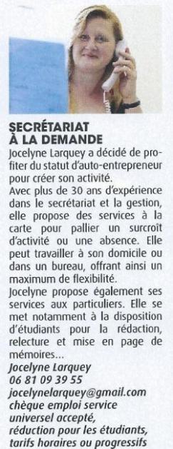 J'ai une expertise de plus de 30 ans dans le secrétariat et la gestion dans différents secteurs. Je propose des services à la carte pour pallier un surcroît d'activité ou une absence de secrétaire. J'exerce soit à mon domicile, soit dans votre structure. J'offre ainsi disponibilité, réactivité et économie (paiement à la prestation, pas de charge sociale, pas de frais d'intérimaire, pas d'investissement en matériel informatique). Devis gratuit établi sur demande. Tarif horaire ou forfaitaire.