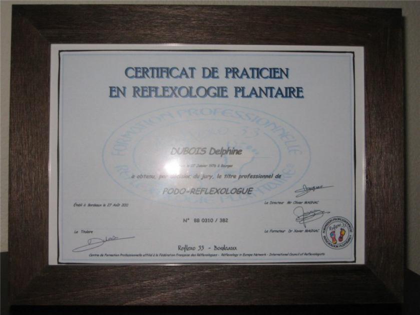 Je suis réflexologue certifiée et affiliée à la Fédération Française des Réflexologues après avoir exercée plusieurs années dans le milieu médical en qualité d'aide soignante (diplômée en 1997). En 2010, j'ai été formée à la réflexologie dans un centre agréé de Bordeaux auprès d'un médecin durant 1 an 1/2 puis certifiée en 2011 à l'issue d'un mémoire de 9 mois.