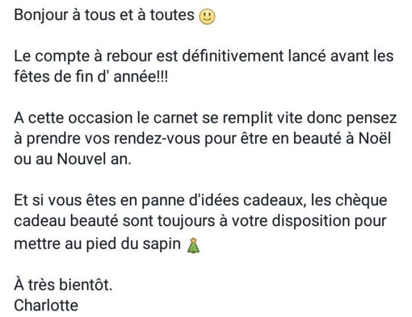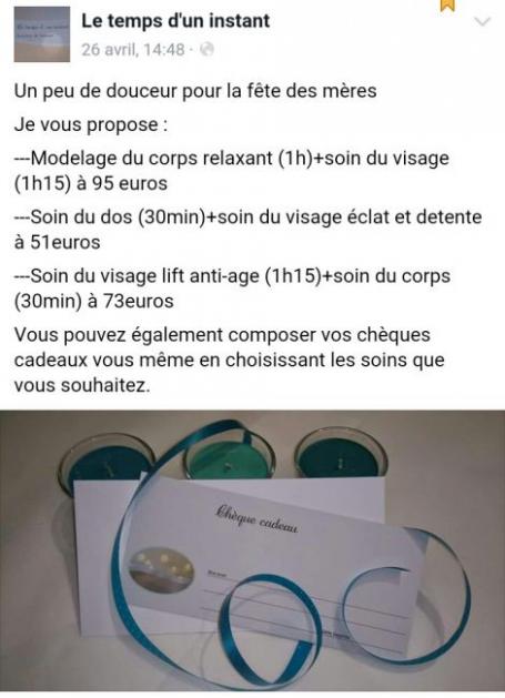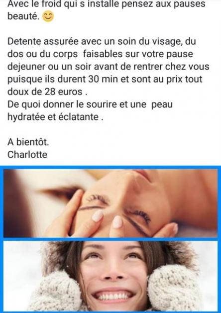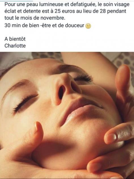 Je vous propose des épilations , des soins du visage pour chaque type de peaux , des soins détente du corps ainsi que des soins plus spécifiques ( jambes lourdes , soin minceur ),ainsi que des soins pour la beauté des mains et des pieds, pose vernis classique ou semi-permanent et du maquillage.